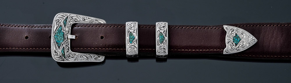 EF48T 1" fine engraved with turquoise chip inlay 4 piece buckle